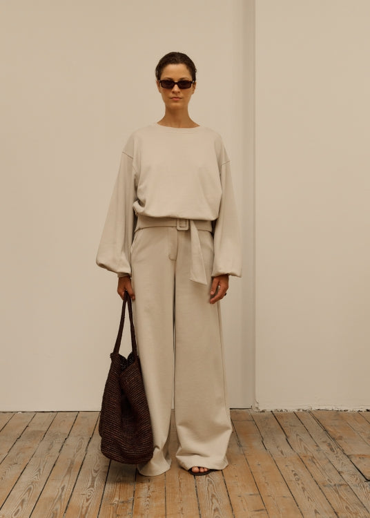 Minimalistisches Oversized-Sweatshirt von Club L’Avenir in warmem Sand-Ton mit integriertem Taillengürtel. Skulpturale Silhouette, weiche Premium-Qualität und klare Linien — typisch für die ruhige, architektonische Ästhetik der Marke. Ideal als Statement-Basics für moderne, reduzierte Looks.