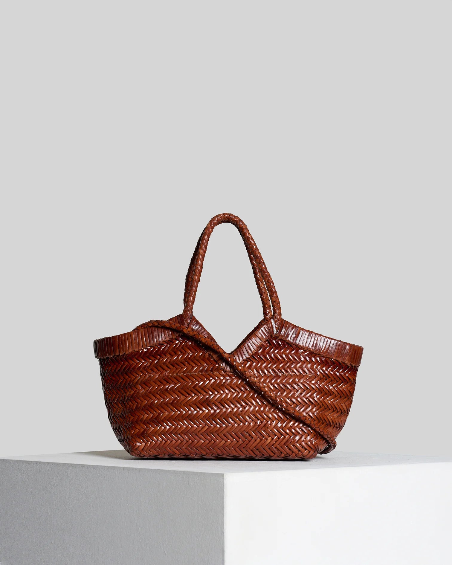 Handgeflochtene Ledertasche in warmem Cognac-Ton, gefertigt in Italien. Die kunstvolle Flechtstruktur, die weich geschwungene Silhouette und die praktische Innentasche für Wertsachen vereinen Design und Funktionalität auf höchstem Niveau.